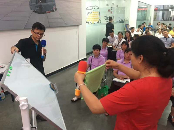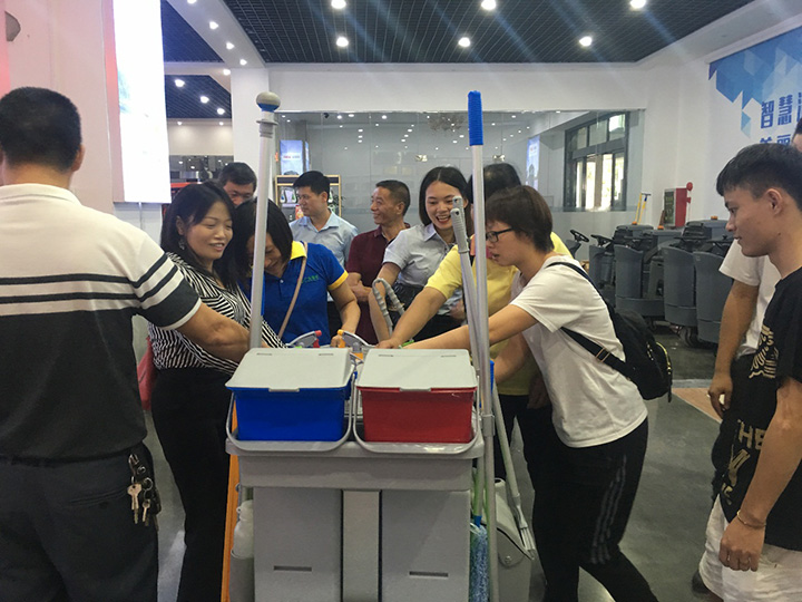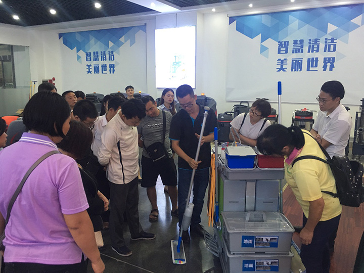 通過講解演示,讓來賓們體驗日常保潔工具(除塵、濕擦、拖地、垃圾收集等)的搭配及使用,連同裝配清潔車和刮玻璃的小比賽,對優勝來賓頒發獎品,對通過考核頒發培訓證書。