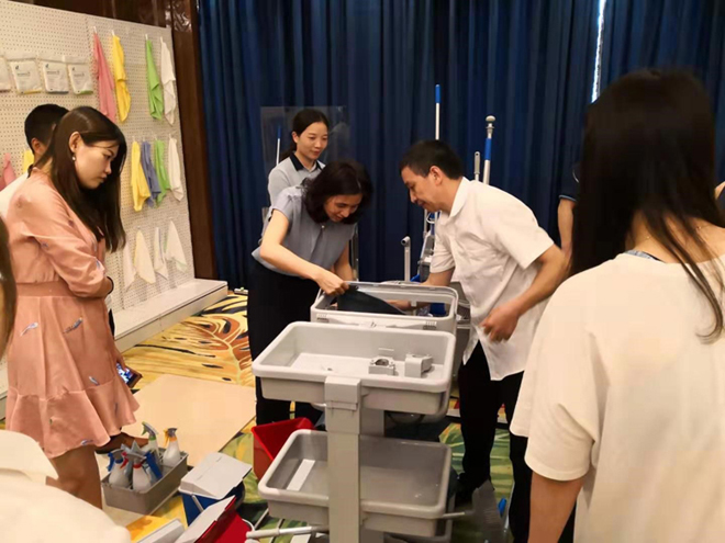 結合拼裝清潔服務車的小比賽,讓來賓們深刻體會到日常保潔中工具的搭配及使用。