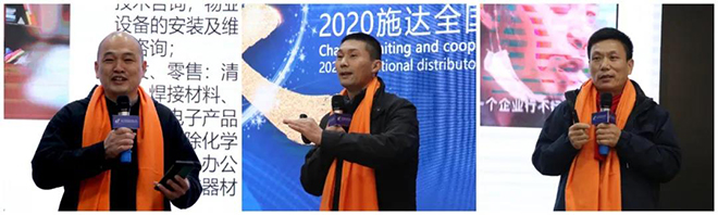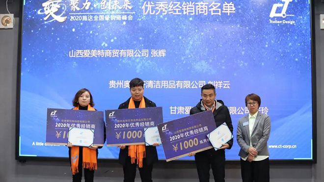 在大會頒獎環節,頒獎嘉賓分別向2020有突出貢獻的施達經銷商進行頒獎,山西愛美特商貿有限公司、貴州奧麗齊清潔用品有限公司、甘肅愛科林科技有限公司榮獲“2020施達優秀經銷商”稱號。
