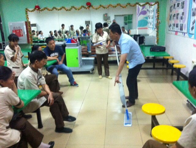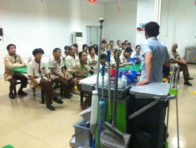 日前佛山某大型廣場全線采用CT施達噴灑平拖中央清潔系統及儲備箱式服務車平臺。當天項目管理人及保潔員接受施達產品培訓師的現場培訓指導,培訓內容包括顏色分區管理、平拖系統應用以及各種工具操作。